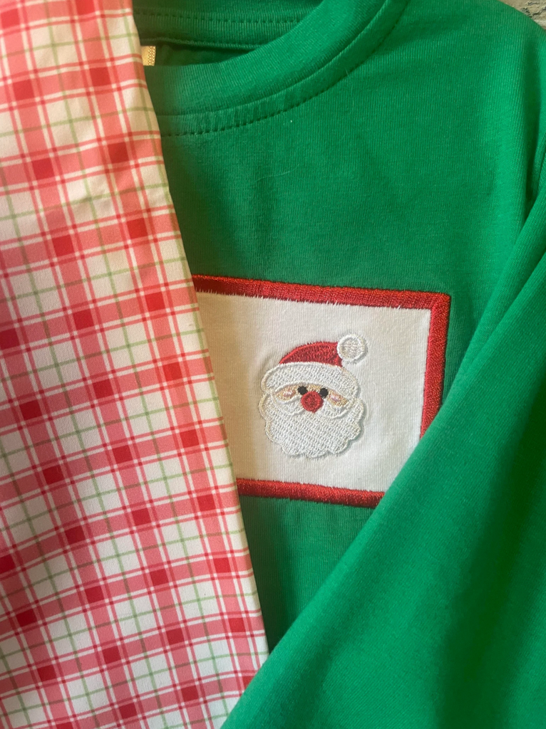 Get your little one holiday-ready with this charming Christmas outfit! Crafted from 100% soft cotton, the green appliqué top features a festive Santa monogram, perfectly paired with cozy red plaid pants. Easy to care for with machine wash and lay flat to dry, it fits true to size—check the size chart for the perfect fit. Made in the USA by a trusted partner, this playful set brings festive cheer and comfort to your boy’s holiday wardrobe.