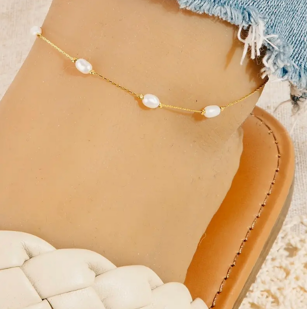 Add a touch of playful elegance to your outfit with this Pearl Gold Anklet. Featuring a delicate station chain dotted with fresh water pearls, it strikes the perfect balance between subtle charm and eye-catching flair. Crafted from a blend of 50% brass and 50% fresh water pearls, this anklet effortlessly elevates any look, making your ankles the center of attention with a fun, shimmering twist.