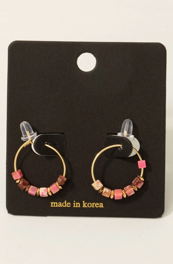 Elevate your style with these charming hoop earrings featuring playful stone cube beads on delicate wire hoops. Crafted from brass, gemstone, and glass, they add a fun pop of texture and sparkle—perfect for turning everyday outfits into eye-catching looks.