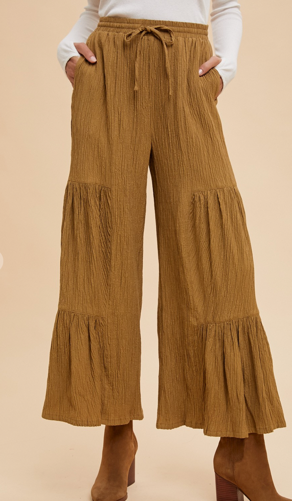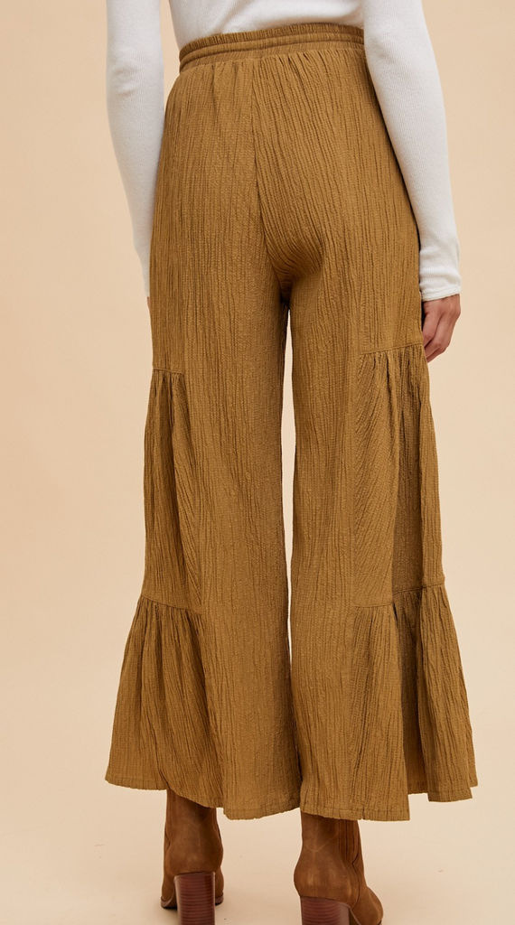 Step into comfort and style with these wide-leg pants crafted from textured woven fabric. Featuring a playful tiered detail and a full-length cut, they flow effortlessly with every move. The elastic waistband ensures a snug yet flexible fit, making them perfect for both lounging and outings. Embrace a look that’s as fun as it is easygoing!